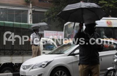Photo Caption : Traffic policemen having a tough time controlling the traffic in this gloomy weather due to cyclonic effect was the order of the day, as rains lashed out continuously, in Bengaluru on Monday 9th November 2015