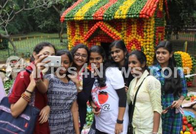 Photo Caption : Visitors seen taking selfies in the backdrop of Childrens Day Flower show preparation for the upcoming Childrens Day celebrations at Cubbon Park, in Bengaluru on Friday 13th November 2015