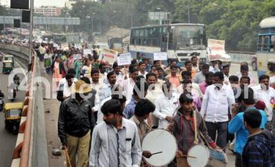 Photo Caption : Members of Karnataka State Social Welfare Department hostel wardens association partake in protest rally from City Railway Station to Freedom Park to full fill their various demands, in Bengaluru on Tuesday 17th November 2015