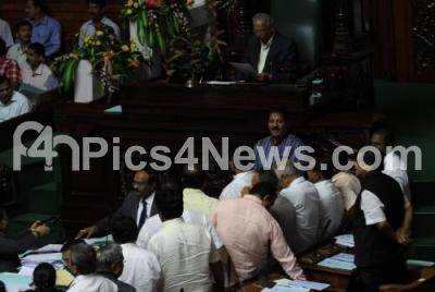 Event Description : BJP party MLAs seen protesting against Minister Anjaneya, in the bribe case, in the presence of CM Siddaramaiah during the Assembly Session at Vidhan Soudha, in Bengaluru on Friday 27th November 2015