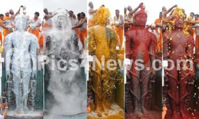 Photo Caption : Devotees performing abhisheka to the statue of Gomateshwara on the occasion of Masthakabhisheka near Mysuru, on Sunday 29th November 2015