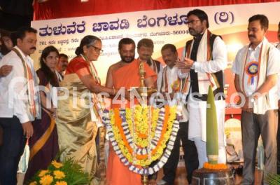 Photo Caption : Sri Sri Sri Vidyavachaswathi Vishwa Santhosh Bhrathi Sripadaru with Dr Indira Hegde, KV Rajendra Kumar and others inaugurated the Tuluvere Chavadi program at Dr Rajkumar Kalakshethra, Rajajinagar, in Bengaluru on Sunday 29th November 2015