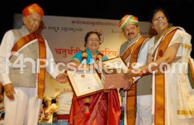Photo Caption : Governor Vajubhai Rudabhai Vala and Minister TB Jayachandra seen presenting Doctor of Literature to Late KSL Swamy, being received by his wife BV Radha during the 4th Annual Karnataka Samakrutha Vidyalaya convocation at Kuvempu Kalakshetra, organised by Karnataka Samakrutha Vidyalaya, in Bengaluru on Wednesday 2nd December 2015