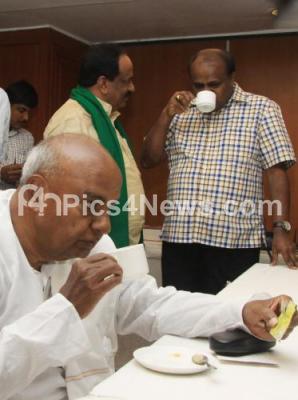 Photo Caption : JDS Party supremo and National President HD Devegowda with former CM and JDS leader HD Kumarswamy seen having a cup of tea at the JDS legislative party meeting at Hotel Chancery Pavilion, in Bengaluru on Wednesday 2nd December 2015