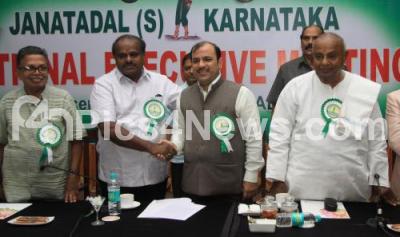 Photo Caption : Kunwar Danish Ali, Secretary General JDS party being greeted by HD Kumarswamy, Karnataka State JDS President and HD Devegowda, JDS National President during the JDS National Executive Committee meeting at Hotel Lalit Ashok, in Bengaluru on Thursday 3rd December 2015