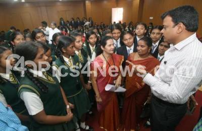 Photo Caption : Indiranagar RTO C Mallikarjuna with Prof M Lokeshwari, R V College and school principal Elizabeth seen interacting with students to create awareness on Pollution, in Bengaluru on Tuesday 8th December 2015