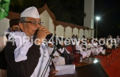 Photo Caption : Maulana Mufti Ashraf Ali Saheb with other Muslim scholars and leaders seen addressing the a large Muslim protest gathering against the hate speech by Kamlesh Tiwari, working president of Hindu Mahasabha oufit in UP, on Prophet Muhammed, PBUH, the protest gathering was held at Khadria Mosque, Millers road, in Bengaluru on Friday 11th December 2015