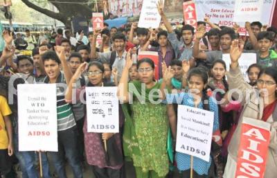 Members of AIDS All India Democratic Students Organizations partake in protest demonstration as a part of all India protest day demanding Indian Government to come out of WTO and GATS, the protest was held at SBM Circle, in Bengaluru on Saturday 12th December 2015