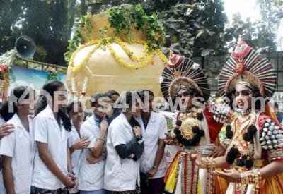 Photo Caption : Ayush college students with Yakshagana artists seen during "Ayur Jyothi Ratha Yatre" at Ayush College, Anand Rao Circle, in Bengaluru on Monday 14th December 2015