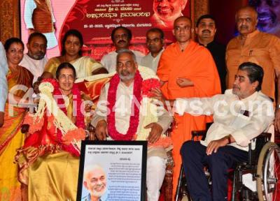 Photo Caption : Nirmalanandanath Swamiji with Prof Siddalingaiah, KM Nagaraj and others seen felicitating Minister A Manju during the Abhinandana program at Jnana Jyothi Auditorium, in Bengaluru on Tuesday 15th December 2015
