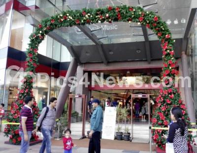 Photo Caption : Shoppers walk past huge Christmas tree arch put up in front of a mall at Koramangla in Bengaluru ahead of the Christmas and New Year Celebrations, in Bengaluru on Tuesday 15th December 2015
