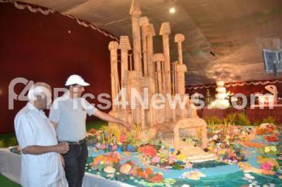 Photo Caption : C Ramachandran, Ex promoter of Nilgiris and chairman of Blue Hill Group with Manish Gaur, Director Institute of Baking and Cake Art seen getting a glimpse of the Lost City of Atlantis, Story Book Cake, Smurfs Village Cake and various others cakes at the 41st annual cake show at St Josephs Indian high school grounds, organised by National consumer fair for the upcoming Christmas and New Year celebrations, in Bengaluru on Thursday 17th December 2015