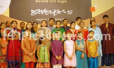 Photo Caption : Contestants singing group song during "Pratibotsava 19" state level Sugama Sangeeta Mela organized by Hombale Pratibaranga at Ravindra Kalakshetra, in Bengaluru on Sunday 20th December 2015