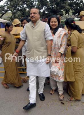 Photo Caption : Union Minister Ananth Kumar and MLC Tara coming out after casting their vote during Legislative Council elections at BBMP council Hall, in Bengaluru on Sunday 27th December 2015