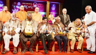 Nidumadi Mutt Senior Students being felicitated by Former CM and BJP MP BS Yeddiyurappa, during "Belli Habba" programme organized by Dr Sri Jachani Rastriya Seva Peeta, Nidumadi Matt at Ravindra Kalakshetra, also seen are Sri Veerbhadra Channamalla Mahaswamiji, Critic Asha Devi and others, in Bengaluru on Tuesday 29th December 2015