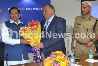 Photo Caption : Home Minister G Parameshwar being welcomed by Om Prakash, DG and IGP and NS Megharaik, Commissioner of Police Bengaluru city during the valedictory function of the Crime Prevention Month 2015 at Police Commissioner Office, in Bengaluru on Wednesday 30th December 2015