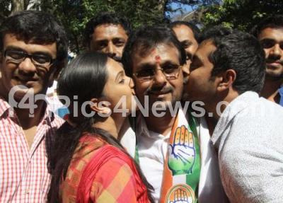 Photo Caption : Congress candidate Narayana swamy seen celebrating with his family members after the results were announced for the legislative council seat in the MLC Elections from Bengaluru Rural South Constituency outside Maharani College , in Bengaluru on Wednesday 30th December 2015