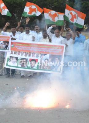 Photo Caption : Congress supporters seen bursting crackers after the results were announced in the MLC elections at Anand Rao Circle, in Bengaluru on Wednesday 30th December 2015
