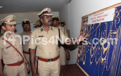 Photo Caption : P Harisekaran, Additional Commissioner of Police inspecting the recovered jewelry during press conference at Commissioner of Police Office, in Bengaluru on Monday 4th January 2016