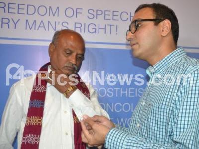 Photo Caption : Cancer patient Ramakrishna being briefed about the newly innovated voice box prosthesis which was implanted successfully after a surgery by Dr Vishal Rao, Head and Neck Surgeon HCG, an imported prosthesis being very expensive and by the invention of Indian prosthesis being made affordable for throat cancer patients to reagain their voice, the HCG press conference was held at JW Marriott Hotel, in Bengaluru on Friday 8th January 2016