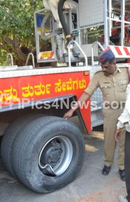 Photo Caption : Fire department personnel seen inspecting the tyre of the fire tender vehicle which burst with a huge sound near Vikas Soudha, in Bengaluru on Wednesday 13th January 2016