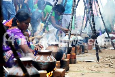 Event Description : People preparing sweet pongal on the occasion of Sankranti (Pongal festival) celebrations at Sudhamnagar, in Bengaluru on Friday 15th January 2016