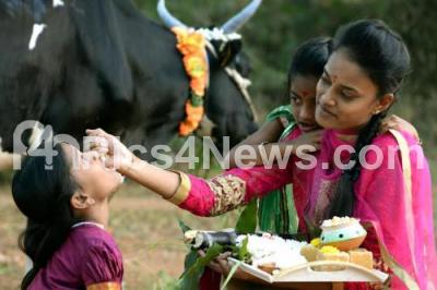 Event Description : People offering ellu bella and sugarcane to cows in celebration of Makara Sankranti festival, in Bengaluru on Friday 15th January 2016
