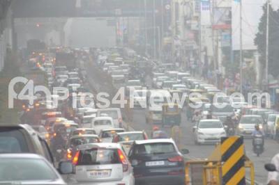 Photo Caption : Heavy mist and rains created a cold climate in Bengaluru city, motorists had a tough time driving their vehicles in heavy mist on MG Road, in Bengaluru on Wednesday 20th January 2016
