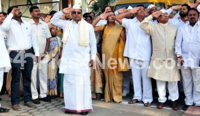 Photo Caption : CM Siddaramaiah partake in 67th Republic Day celebrations at Congress office, in Bengaluru on Tuesday 26th January 2016