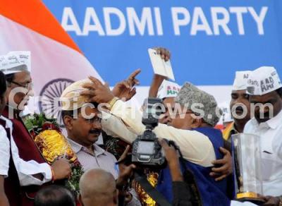 Photo Caption : Delhi CM Arvind Kejriwal being felicitated at the Auto Rickshaw Drivers and Auto Rickshaw Drivers rally at St Joseph Indian High School Grounds, in Bengaluru on Sunday 31st January 2016