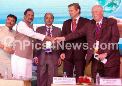 Photo Caption : Minister KJ George seen greeting Tim Waldron, Chairman, Scientific head, International Water Loss Association ( IWA) in the presence of GC Chandrashekhar, chairman ,KUWSSB, TM Vijay Bhaskar, Additional Chief Secretary Urban Development Department and chairman BWSSB, and Ger Bergkemp, Executive Director, IWA during the inauguration of the 8th edition of worlds largest water loss conference “Water Loss 2016†at Hotel lalit Ashok, in Bengaluru on Monday 1st February 2016
