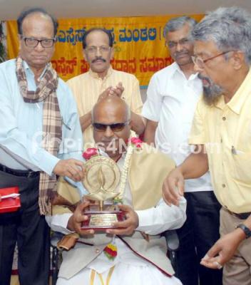 Photo Caption : Prof Chandrashekar Patil presenting "Dr GSS" award to Dr Chandrashekar Nangali at a programme organized by Dr GSS Vishwasta Mandali at National College, also seen are Muddukrishna and Shudra Srinivasa, in Bengaluru on Sunday 7th February 2016