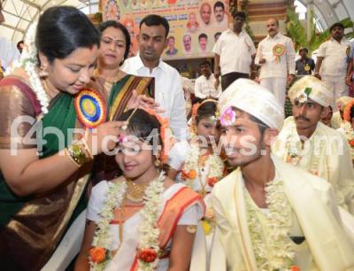 Photo Caption : MLC Tara seen with the Brides and Bridegrooms at the mass marriage program at Banashankari Temple premises, organised by Banashankari Temple mass marriage forum, in Bengaluru on Wednesday 17th February 2016