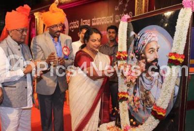 Photo Caption : Minister Umashree with KA Dayanand and others floral tribute to the portrait of Chhatrapati Shivaji, on the occasion of 386th birth anniversary at Ravindra Kalakshetra, in Bengaluru on Friday 19th February 2016
