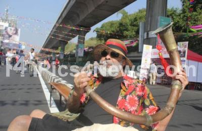 Photo Caption : A man was seen blowing his antique horn and enjoying during the “Open Street†at MG road, 12 hour vehicle free day from 9 am to 9 pm, an initiative planned and executed by the Directorate of Urban Land Transport (DULT) and State Tourism Department and It is designed to promote public transport and urban tourism in the Bengaluru city, in Bengaluru on Sunday 21st February 2016