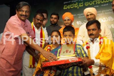 Photo Caption : Nallur Prasad with Narayan Gowda, Shivananda Shivacharya Swamiji and Shri Rudra Muni Shivarcharya Swamiji presenting the best farmers family award to a farmer on the occasion of birthday celebration of former CM BS Yeddyurappa at Gandhi Bhavan, organised by Veerashaiva Lingayuta Yuva Vedike, in Bengaluru on Saturday 27th February 2016