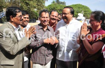 Photo Caption : Manu Baligar is seen with Mukhyamantri Chandru, Baragur Ramchandrappa and others at the Kannada Sahitya Parishat Elections, in Bengaluru on Sunday 28th February 2016