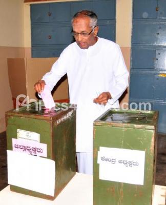 Photo Caption : Go Ru Channabasappa seen casting his vote at the Kannada Sahitya Parishat Elections, in Bengaluru on Sunday 28th February 2016