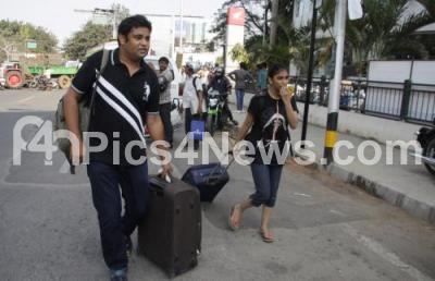 Photo Caption : Passengers were stranded as the agitated farmers had blocked the Devanahalli airport road by driving tractors and marched into the Bengaluru city to lay siege to the Vidhana Soudha, demanding permanent water solution for Kolar and Chickballapur districts, traffic jams were reported the new airport road, in Bengaluru on Thursday 3rd March 2016