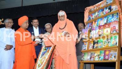 Photo Caption : Suttur Mata, Mysuru Jagadhguru Sri Sri Shivarathri Deshikendra Mahaswamiji with Gnanaguru Rudrakshi Mata Siddarama Swamiji, Rtd IAS Dr C Somashekar, President of Sharana Sahithya Parishat, Dr Go Ru Channabasappa and others releasing the 108 Books at SJR College, Ananda Rao Circle, in Bengaluru on Sunday 6th March 2016