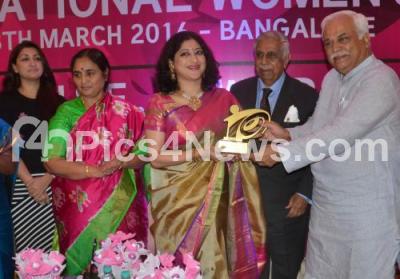 Photo Caption : Minister RV Deshpande with Former Justice MN Venkatachalaiah presenting a memento to Actress Lakshmi Gopalswamy, on the occasion of International Womens Day 2016 at Le Meridian Hotel, organised by Awake, in Bengaluru on Tuesday 8th March 2016