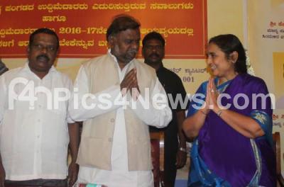 Event Description : Minister H Anjaneya being greeted by Ratna Prabha, IAS, and Dr L Hanumanthaiah during the Karnataka State SCST business conference at Capitol Hotel, in Bengaluru on Wednesday 9th March 2016