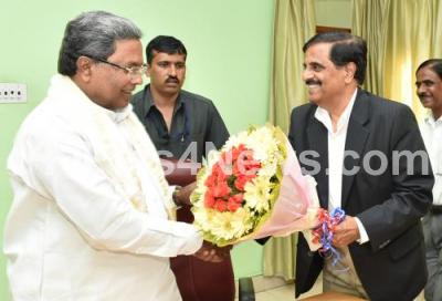 Photo Caption : Newly elected Kannada Sahitya Parishat President Manu Baligar met Chief Minister Siddaramaiah in the presence of Pundalika Halambi at Krishna, in Bengaluru on Friday 11th March 2016