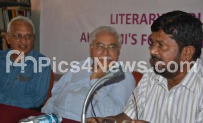 Photo Caption : Eminent Kannada Writer Siddalingaiah with Chandrashekhara Kambar, Vice President Sahitya Academy and Narahalli Balasubramanya seen addressing the literary forum on the occasion of Akademi Foundation Day at Sahitya Academi, Central College, in Bengaluru on Saturday 12th March 2016