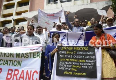 Photo Caption : All India Station Masters Association held at protest to fulfill their various demands at Divisional Railway Manager Office, in Bengaluru on Tuesday 15th March 2016