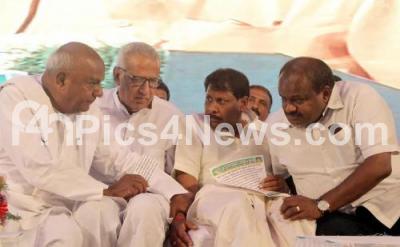 Event Description : Former Prime Minister HD Devegowda seen with HD Kumarswamy, Former Minister Alkod Hanumanthappa, Ismail Saab, Former MLC and others inaugurating the JDS Sangatana Samavesha at Palace ground, in Bengaluru on Saturday 19th March 2016