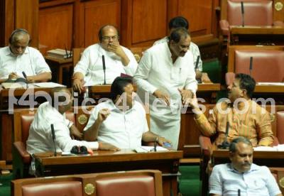Photo Caption : Minister KJ George seen interacting with BJP and JDS MLAs at the Assembly Session at Vidhan Soudha, in Bengaluru on Monday 21st March 2016