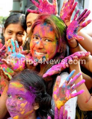 Students seen playing with colors on the occasion of Holi Festival, in Bengaluru on Wednesday 23rd March 2016
