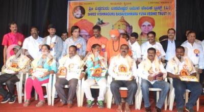 Photo Caption : Sri Sri Shivarudra Mahaswami with Ashok Keni, MLA, and others presenting Basavashri Award to youths, who contributed in various fields during a program at Yavanika, in Bengaluru on Saturday 26th March 2016