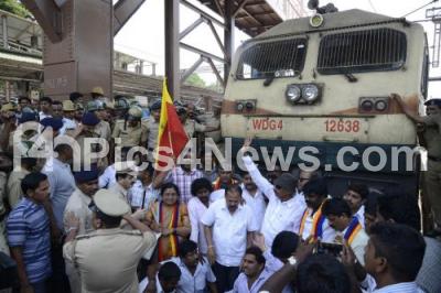 Photo Caption : Members of Kannada Okkoota associations led by Vatal Nagaraj seen stopping the prasanti express train in protest for the Kalasa Banduri Project at Bengaluru City Railway Station for , in Bengaluru on Saturday 26th March 2016
